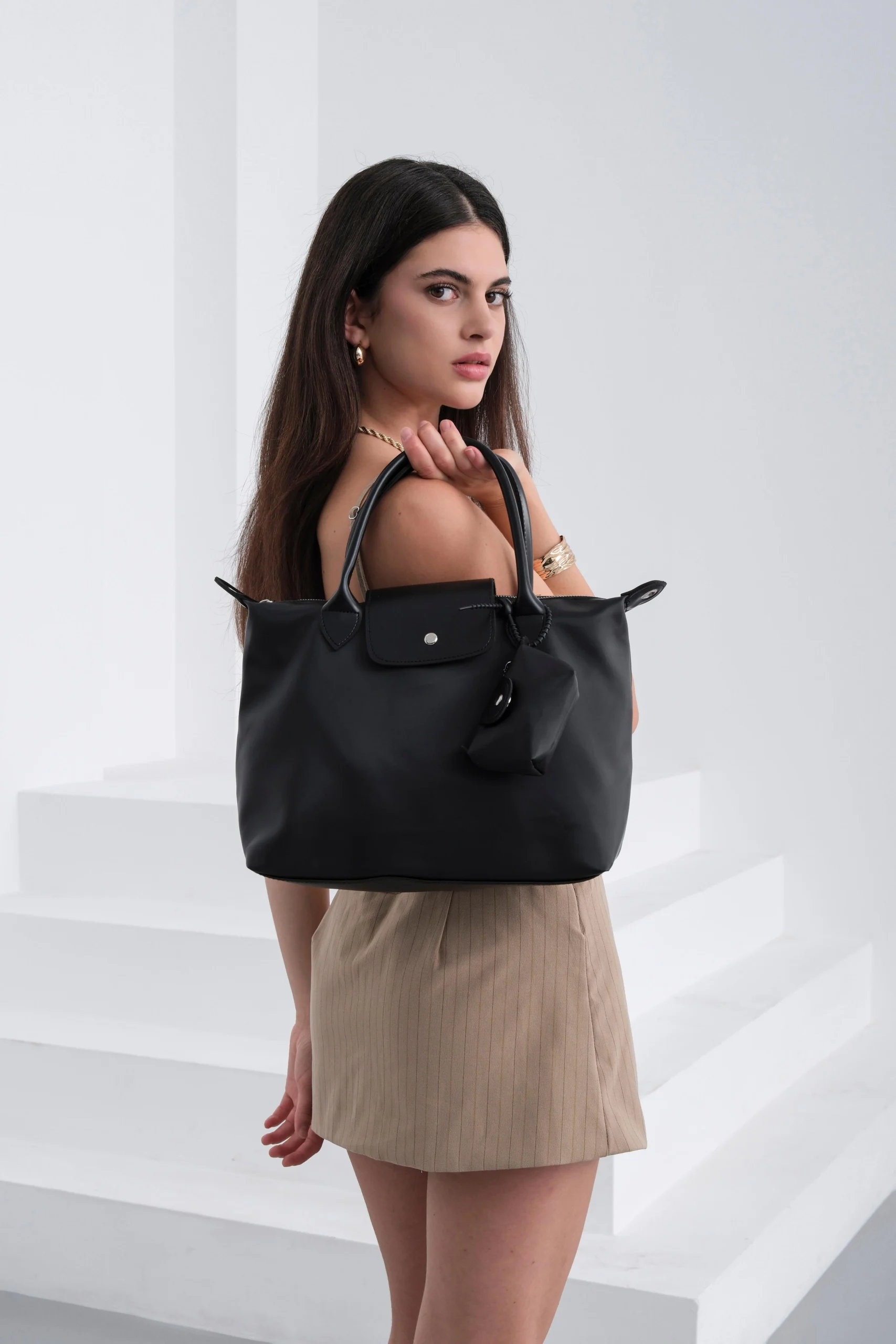 Şehirli ve modern stilin tamamlayıcısı olan bu siyah katlanabilir kadın çantası, hafif yapısı ve dayanıklı su geçirmez nylon kumaşıyla gün boyu konfor sunar.